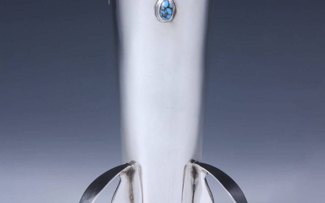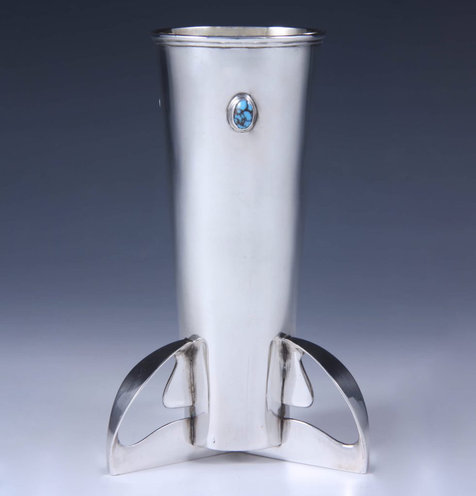 Superb silver Cymric design Arts & Crafts vase with three inset matrix turquoise, made by Liberty & Co. To be